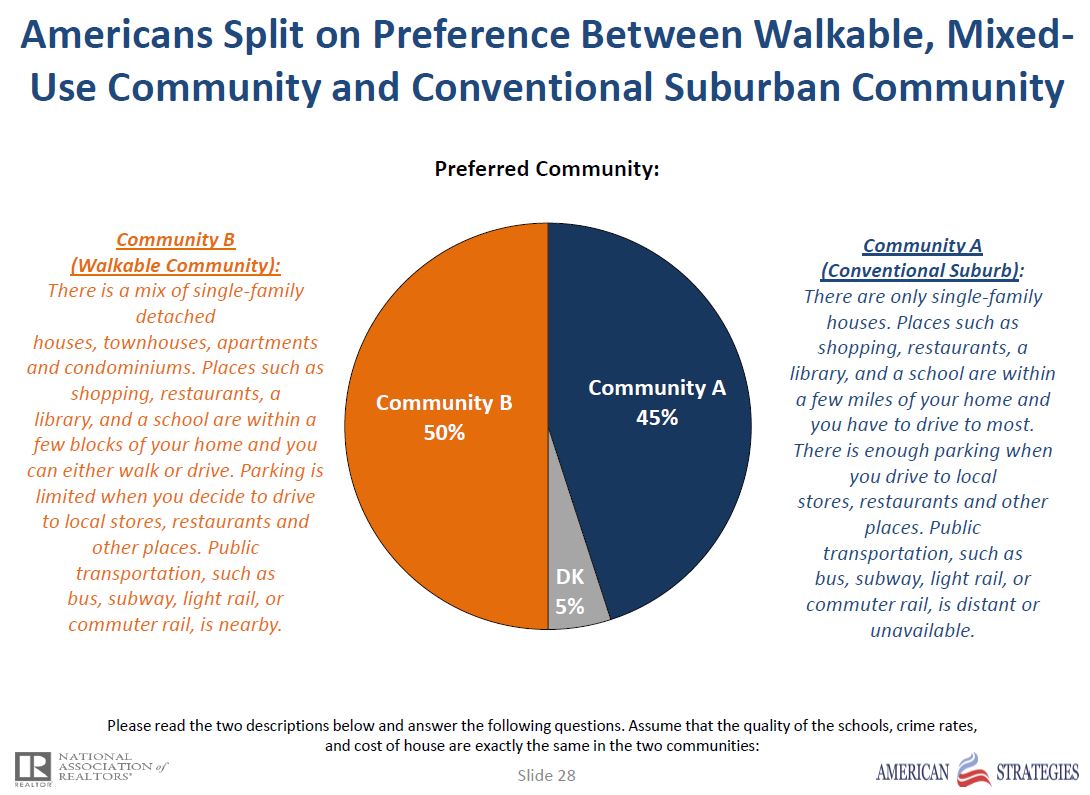 One of the things I was surprised to see is the breakdown between a walkable, mixed-use community and a conventional suburban one to be very balanced.
